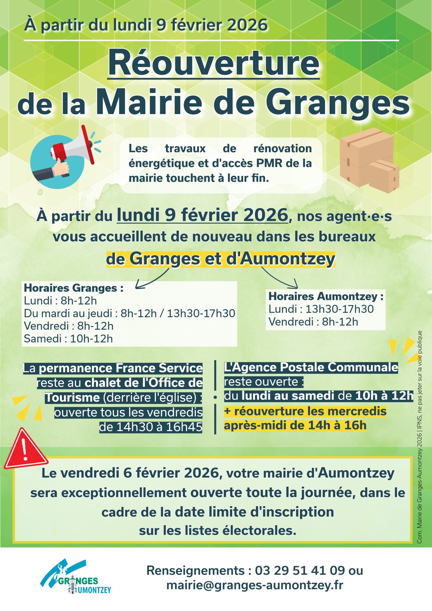 Réouverture de la Mairie de Granges le Lundi 9 février 2026