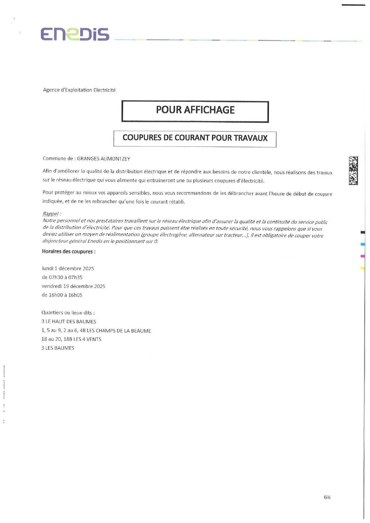 Enedis nous informe de 𝗰𝗼𝘂𝗽𝘂𝗿𝗲𝘀 𝗱𝗲 𝗰𝗼𝘂𝗿𝗮𝗻𝘁 𝗽𝗼𝘂𝗿 𝘁𝗿𝗮𝘃𝗮𝘂𝘅 : 📆 𝗟𝘂𝗻𝗱𝗶 𝟭𝗲𝗿 𝗱é𝗰𝗲𝗺𝗯𝗿𝗲 𝟮𝟬𝟮𝟱 ⏰ de 7h30 à 07h35 – 17h25 à 17h30 📆 𝗩𝗲𝗻𝗱𝗿𝗲𝗱𝗶 𝟭𝟵 𝗱é𝗰𝗲𝗺𝗯𝗿𝗲 𝟮𝟬𝟮𝟱 ⏰ de 16h00 à 16h05 📍 3 le haut des Baumes 📍 1, 5 au 9, 2 au 6, 4B Les champs de la Beaume 📍 […]
