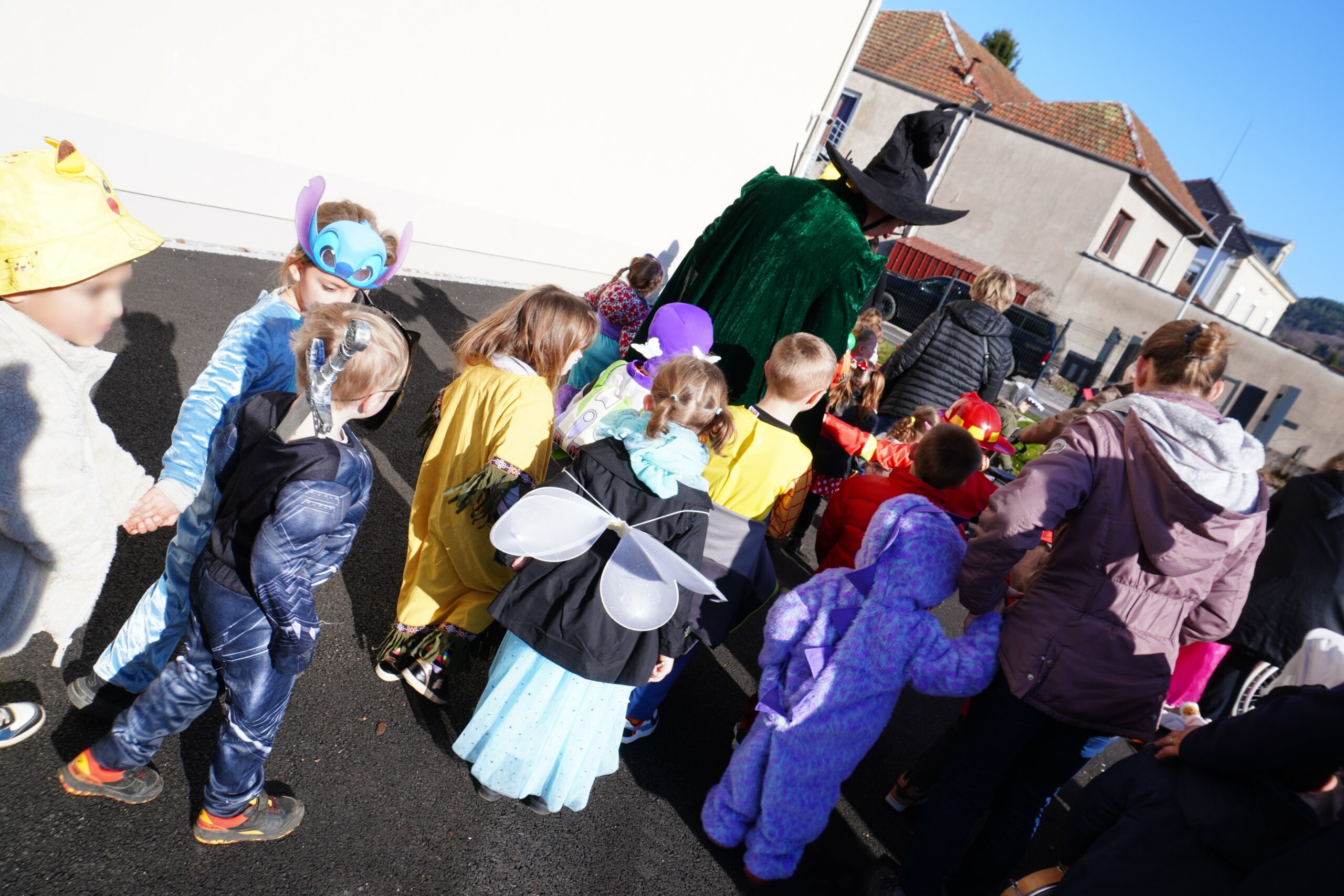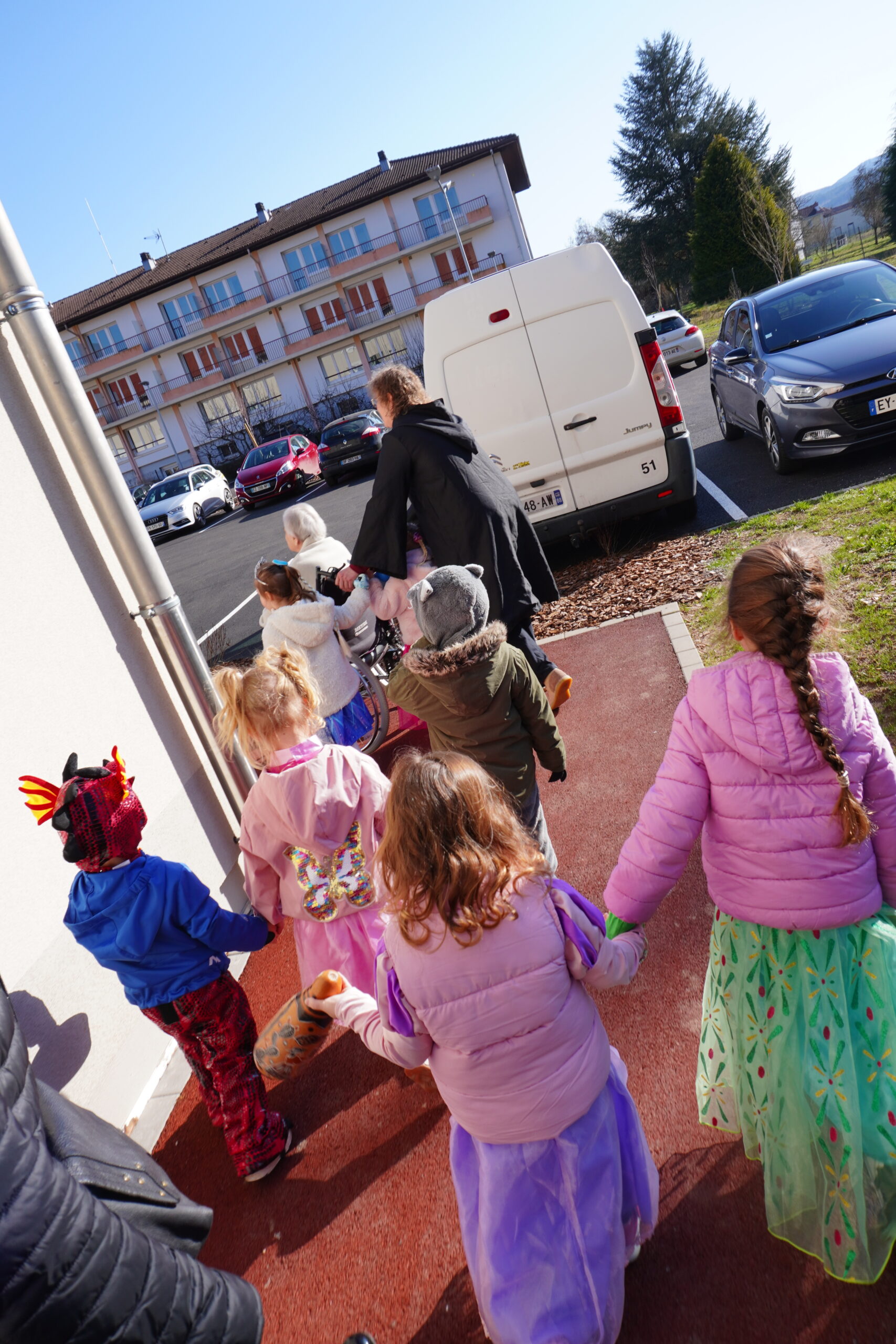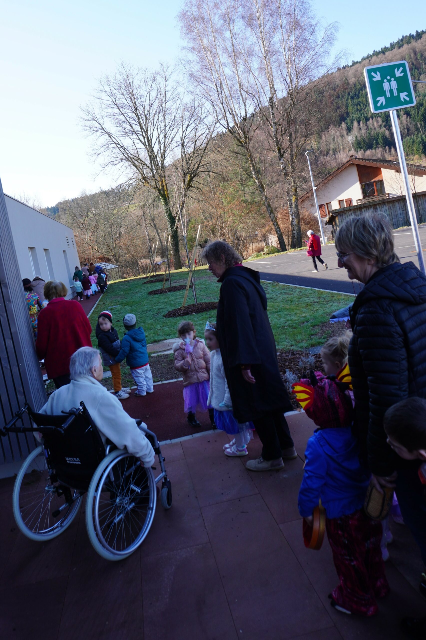Une fois restaurés, les petits de l’école maternelle sont partis défiler avec leurs enseignantes, leurs Atsem et plusieurs membres de l’entourage des enfants, dans les rues de Granges-Aumontzey, affublés de leurs serre-tête, baguettes magiques et autres apparats portés pour l’occasion. Ils ont tranquillement rejoint l’Ehpad Maison Louise Seitz, pour flâner dehors avec les résidents et saluer les plus fragiles spectateurs, présents à leurs fenêtres. Les princesses, justiciers et autres petits personnages incarnés, se sont ensuite dirigés vers « l’école verte » pour aller jouer dans la cour des grands, l’espace de quelques instants.