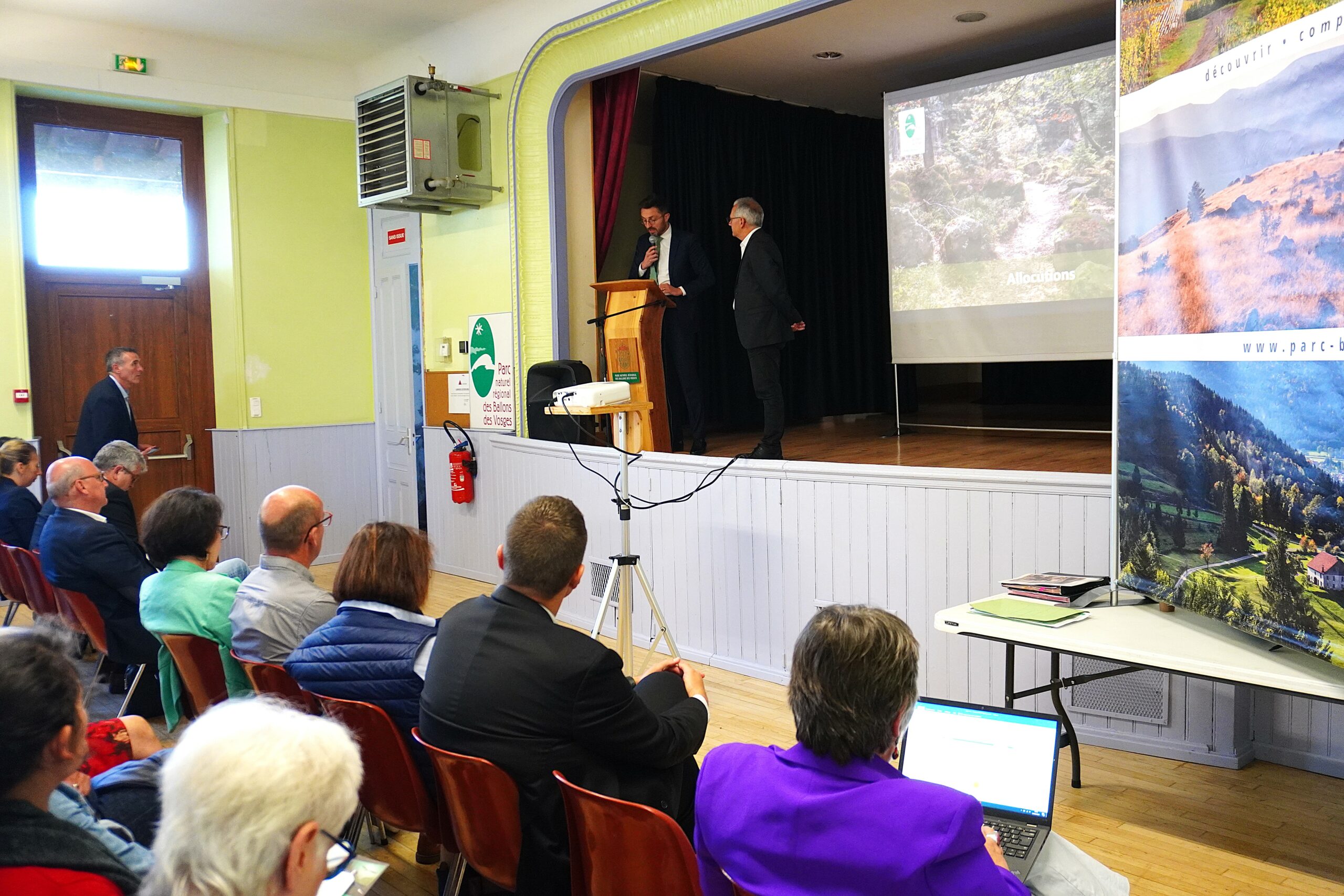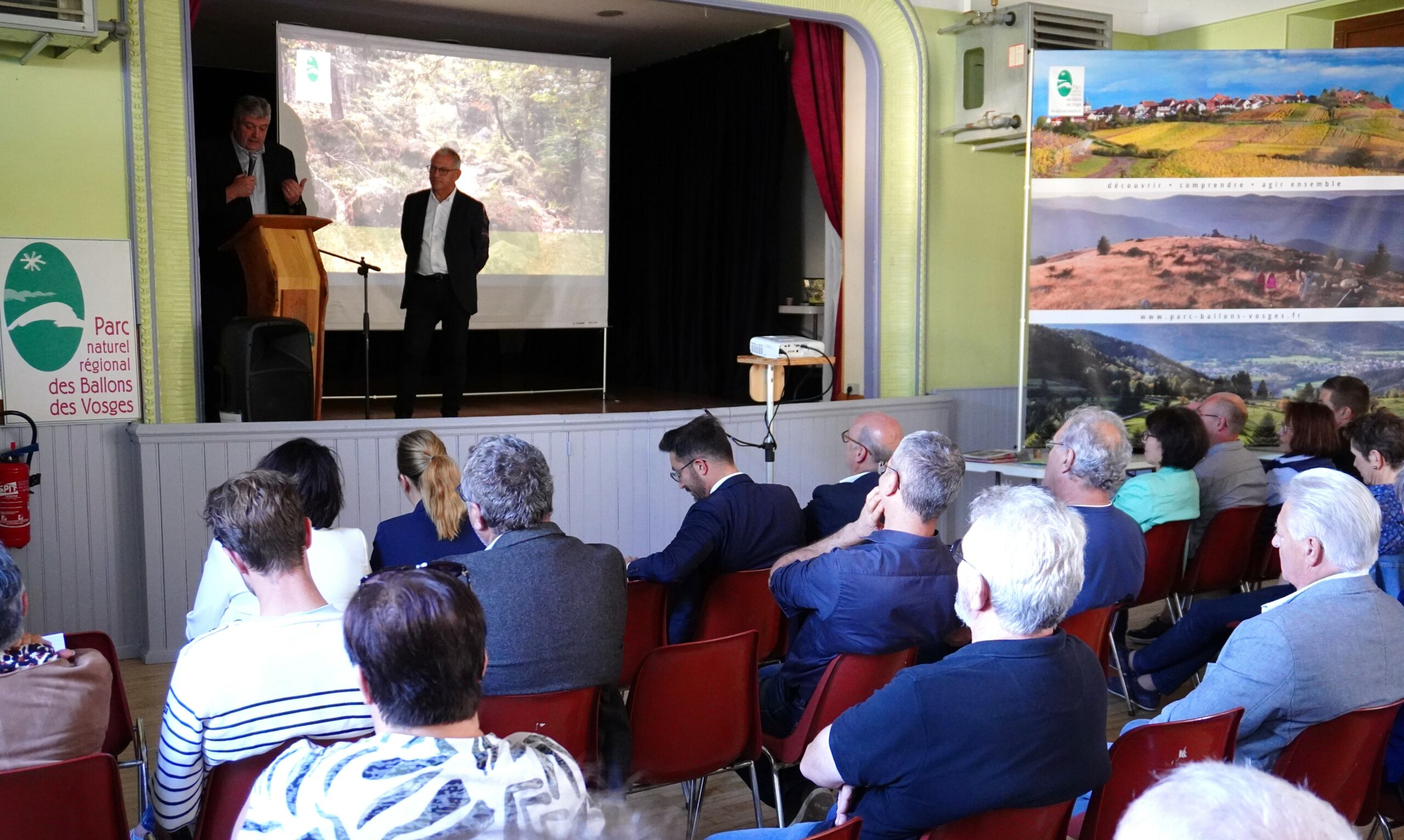 Dans l’assemblée, élus, associations et services de l’état échangeaient sur de nombreux enjeux que porte le PNRBV. Mais revenons d’abord sur les parcs naturels régionaux. Au nombre de 59 en France, la région Grand Est en détient six à elle seule. Celui des Ballons des Vosges est étendu sur quatre départements (Vosges, Bas-Rhin, Haut-Rhin, Haute-Saône) et deux régions (Grand Est et Bourgogne-Franche-Comté), il est d’ailleurs le Parc le plus peuplé de France. Le PNRBV intervient autant sur les volets : développements économique et social du territoire, que sur la préservation et la valorisation de son patrimoine naturel, culturel et paysager. Une charte est inscrite en fil d’Ariane des projets menés par chaque Parc, et celle des Ballons des Vosges arrive à son terme en 2026 et doit être renouvelée pour la période 2027-2041.