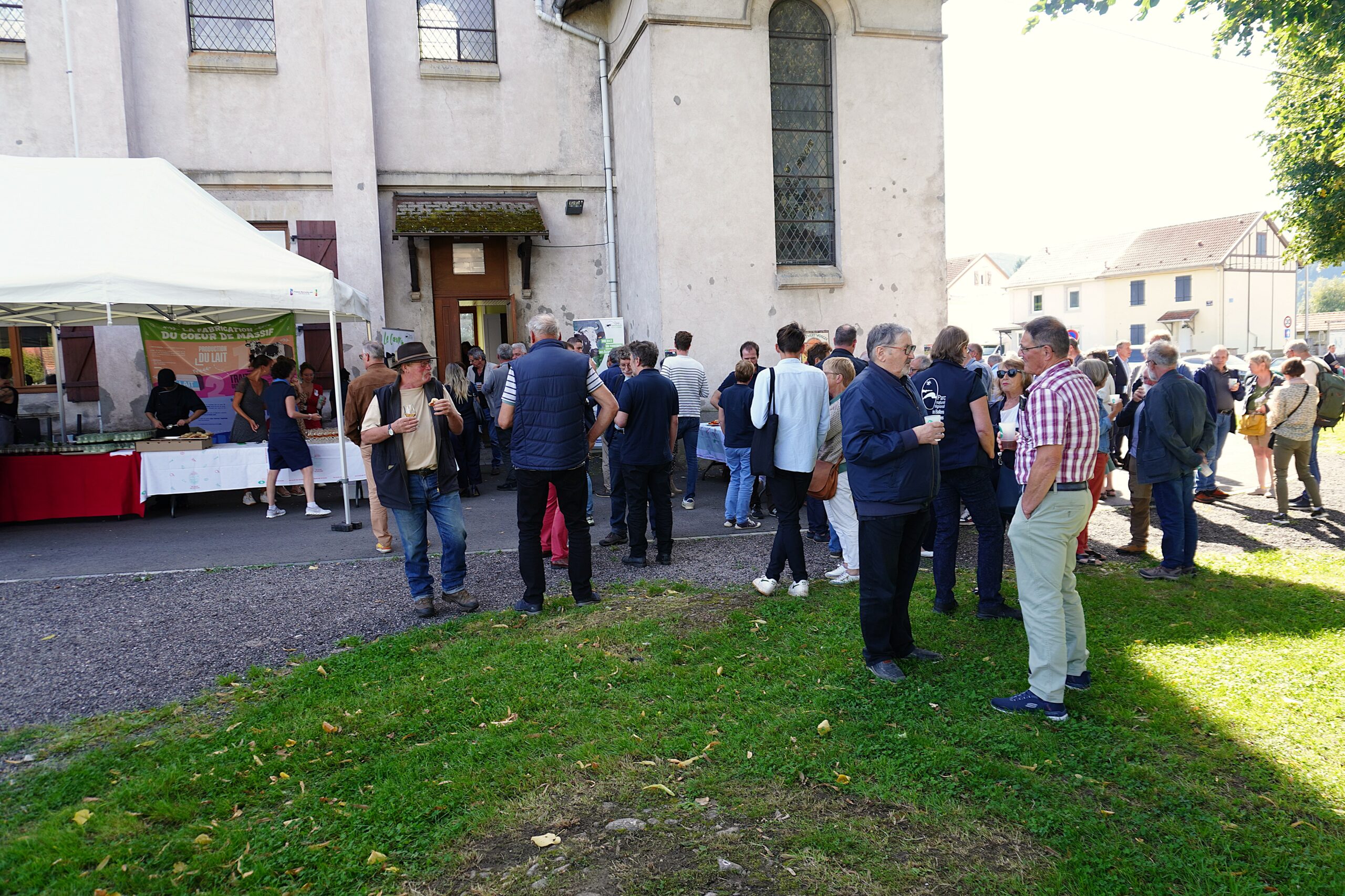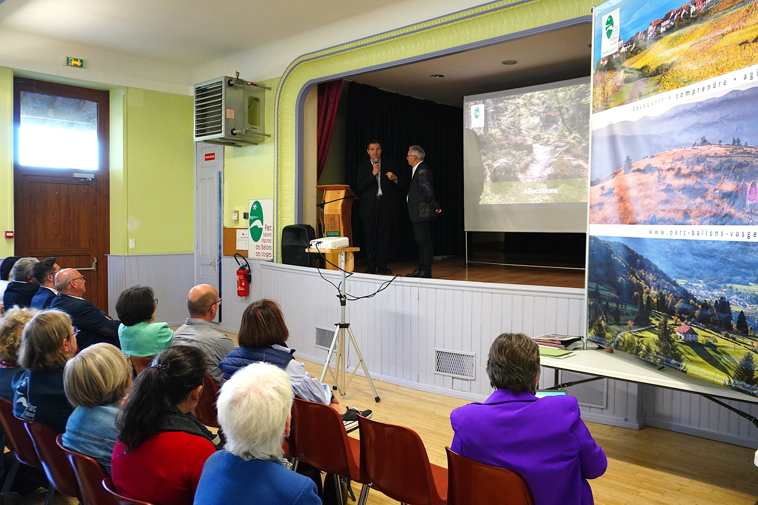 Après un propos introductif de Frédéric Thomas, Maire de Granges-Aumontzey qui souligne « le choix de ce lieu qui nous tient à cœur et qui sera mis à l’honneur aujourd’hui », le Président du Parc, Laurent Seguin a pris la parole. Il a insisté dans son allocution sur l’importance au sein de cette instance de « se mettre autour de la table, au-delà des limites administratives et dogmatiques. » Le sénateur Jean Hingray a également souligné l’importance de l’initiative, là où Jérôme Mathieu – conseiller départemental et Président de la chambre d’agriculture – a confirmé le souhait du Conseil Départemental des Vosges à continuer à travailler aux côtés du Parc, afin que ses habitants, « ceux qui y vivent et ceux qui y travaillent se trouvent bien chez nous ». David Valence, représentant de la région Grand Est, a quant à lui insisté sur la mission de protection patrimoniale d’un Parc. Il a expliqué chercher à inscrire la chapelle Notre-Dame-du-Saint-Rosaire au titre des monuments historiques, dans le cadre de sa présidence à la commission régionale du patrimoine et de l’architecture. Il a également précisé sa vision qui est de fédérer, intervenir avec humilité dans ses actions et innover. Il prend pour exemple la mise en place de la navette des crêtes, gérée désormais par la région Grand Est, mais imaginée initialement par le PNRBV. À sa suite, Antoine Planquette sous-préfet de l’arrondissement de Saint-Dié-des-Vosges enchérira sur « l’outil extraordinaire qu’est le Parc, qui fait vivre une démocratie locale, fédère ses acteurs. » Il précisera que l’État intervient en appui au développement économique du territoire et sur le volet de l’éducation, dans l‘objectif de transmettre des connaissances aux générations futures. Selon lui, un Parc a cette capacité à « expérimenter et innover », quitte à prendre « des risques » et à réfléchir à la possibilité de « dérogations de l’autorité préfectorale ».