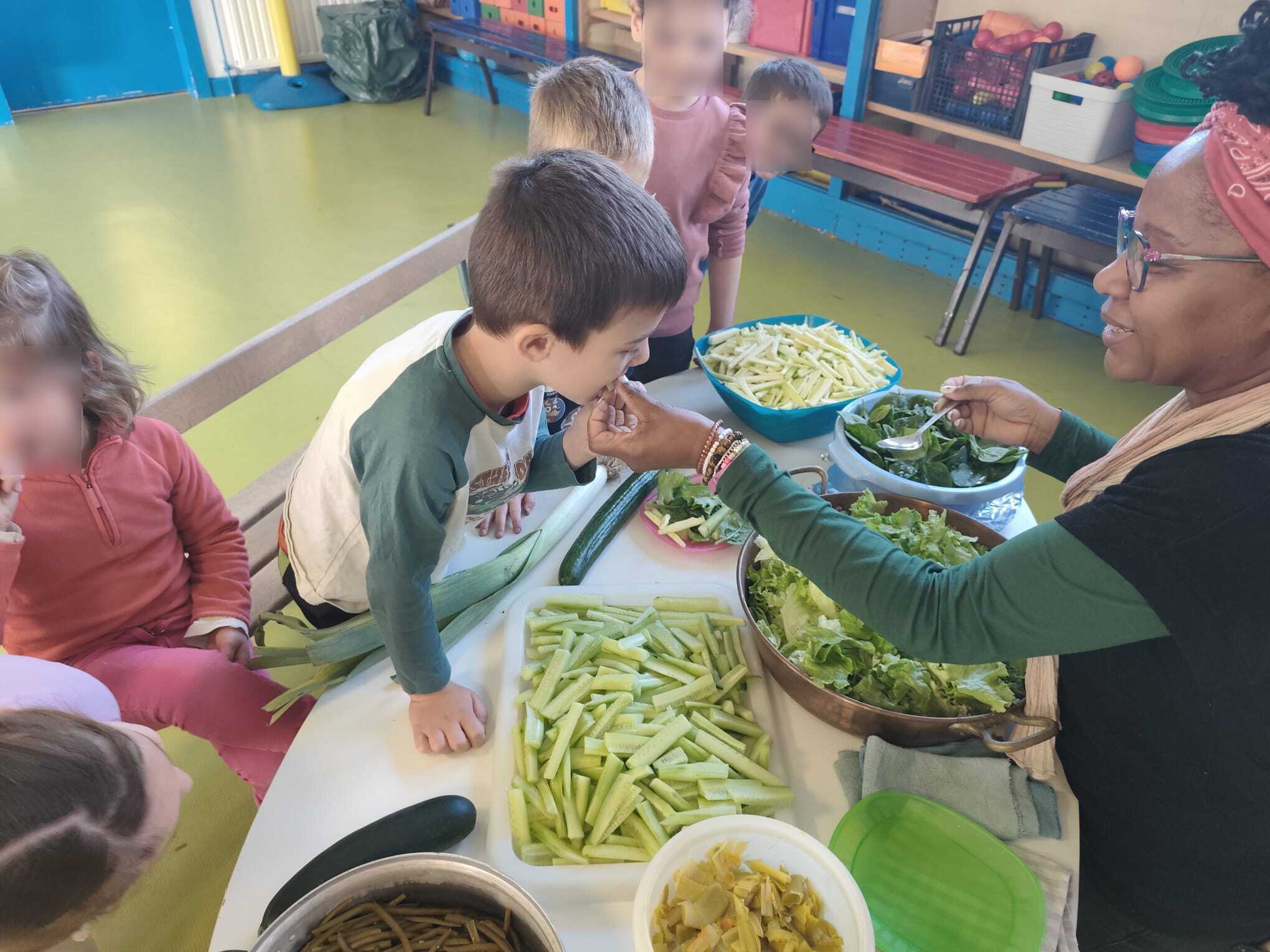 Dès le mercredi, Cloé, Delphine et Pauline, les Atsem de l’école, ont commencé à préparer l’évènement. Avec la participation des parents d’élèves Sandrine Rick et Justine Millasseau, le jeudi, les enfants ont pu s’amuser à trier les aliments par couleurs et à les goûter, pour mieux les (re)découvrir, avant de les cuisiner. Des chants, des danses et des jeux de société sur la thématique leur ont également été proposés. Le lendemain, c’était dégustation collective de la soupe et des biscuits salés confectionnés… Avec beaucoup de fierté !