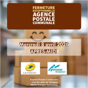 Fermeture exceptionnelle AGENCE POSTALE COMMUNALE : le mercredi 8 avril 2026 après-midi