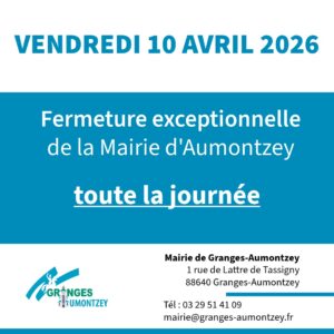 Fermeture exceptionnelle bureau de la Mairie d’Aumontzey le vendredi 10/04