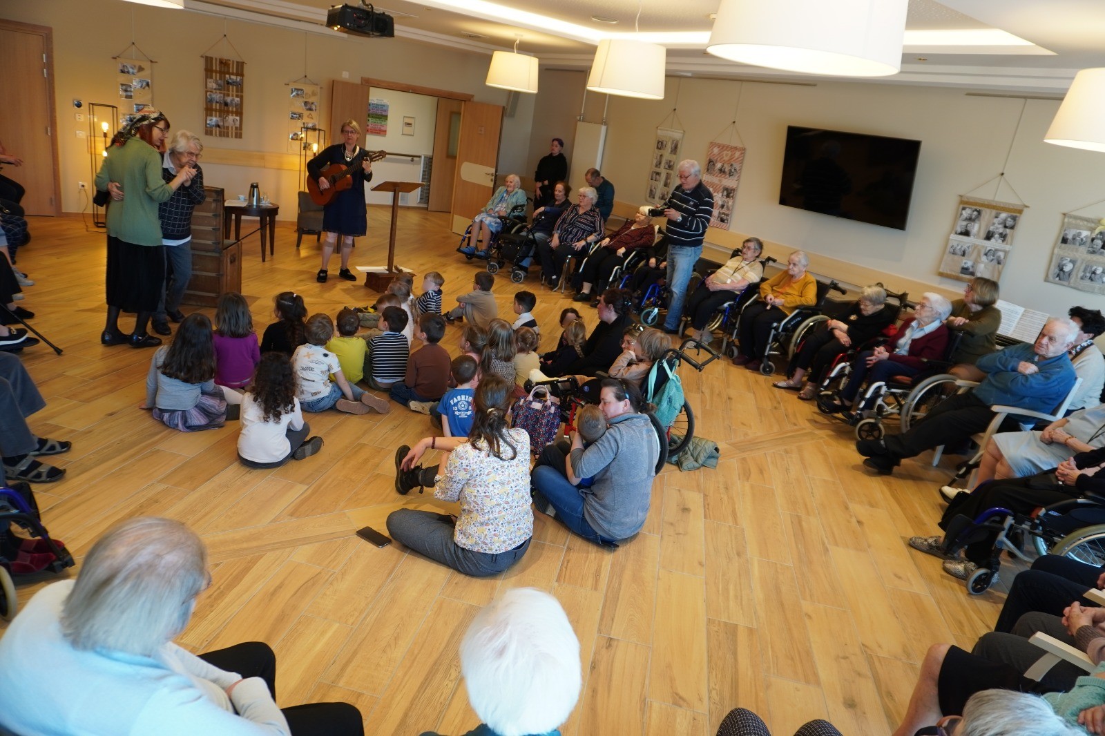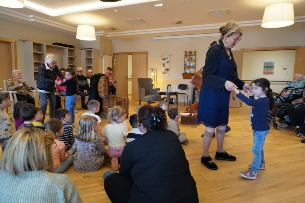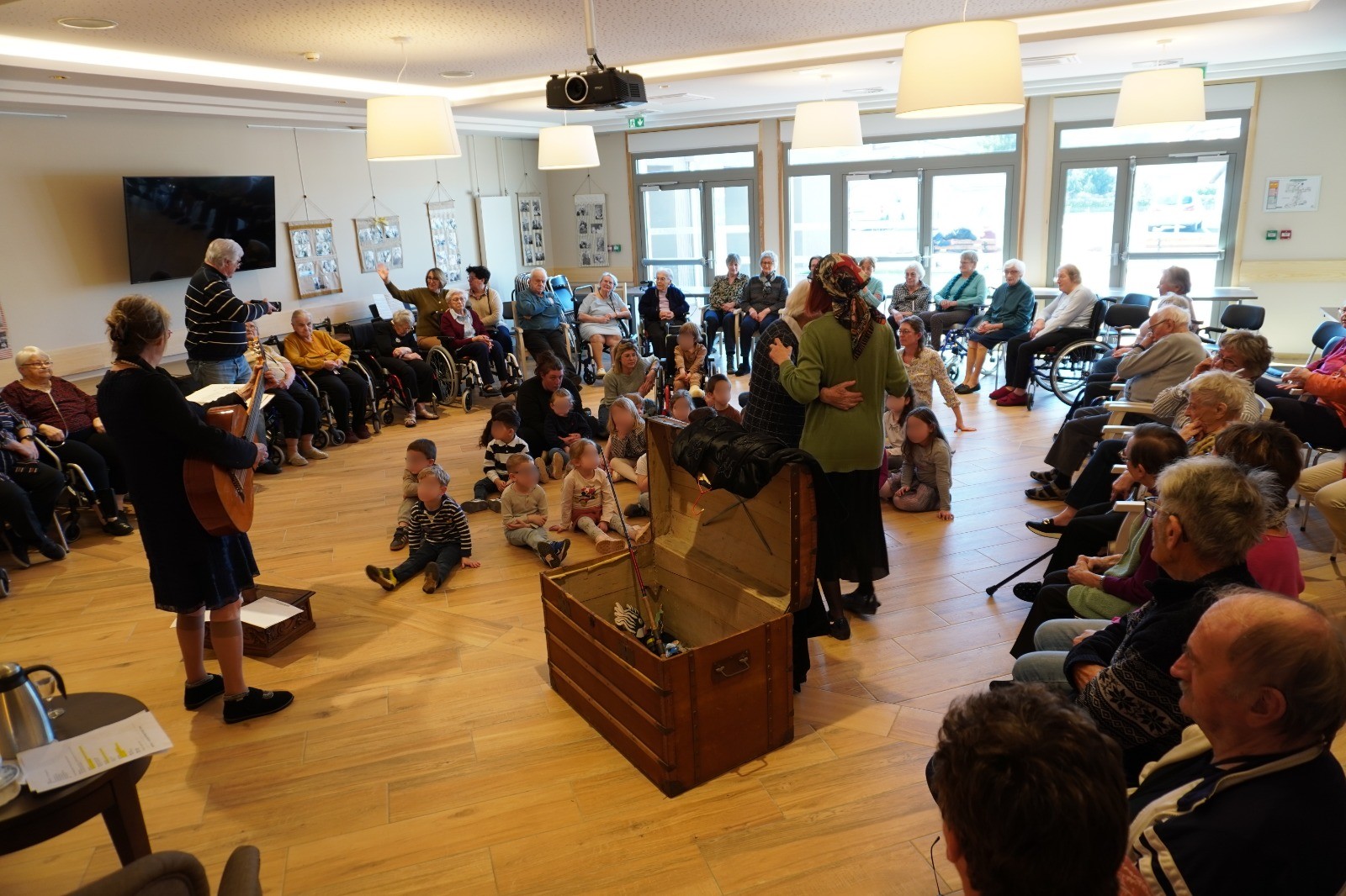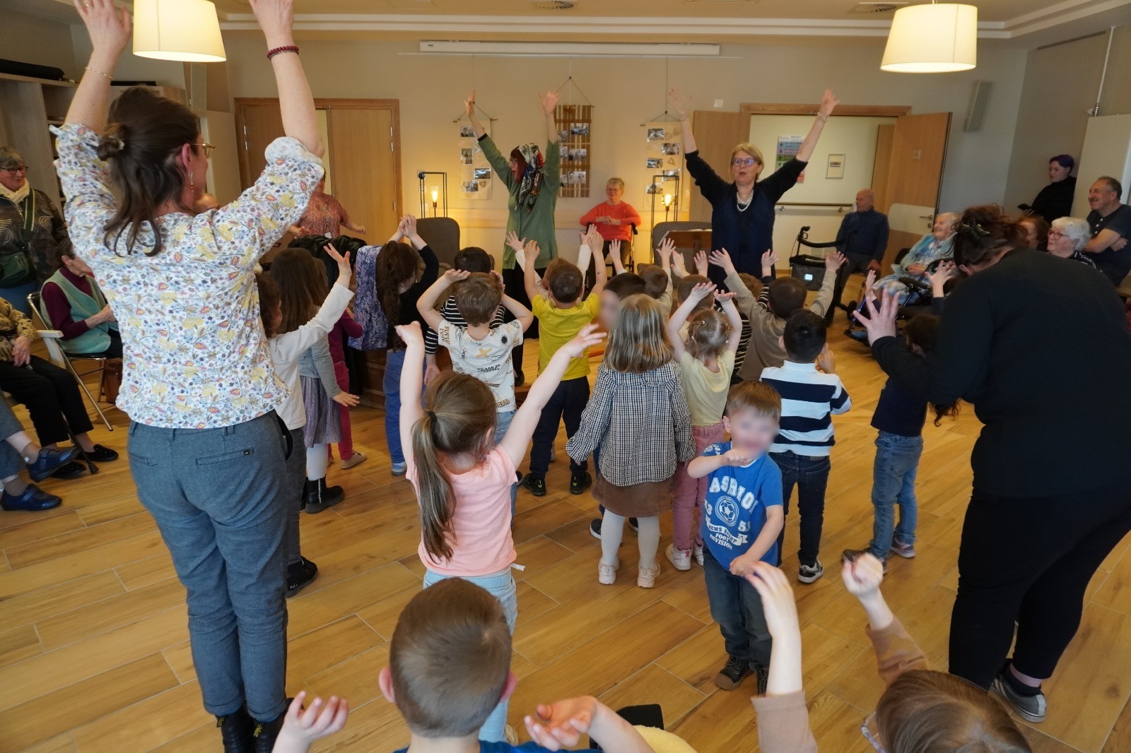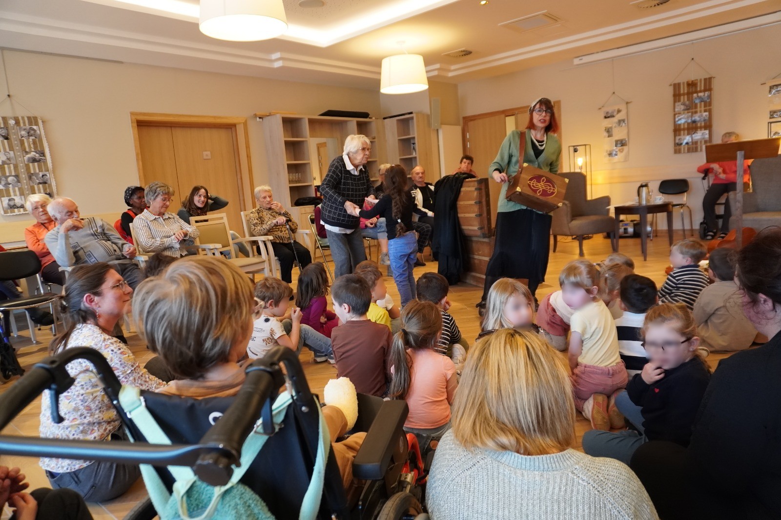 Entourés par les résidents et leurs familles venus en nombre, les enfants ont chanté, ri et dansé avec Suzette et Lucette, deux personnages interprétés par Marion Kieffer-Rys, animatrice coordinatrice à l’Ehpad et Myriam Cochard, médiatrice culture et lien social pour le Conseil Départemental.