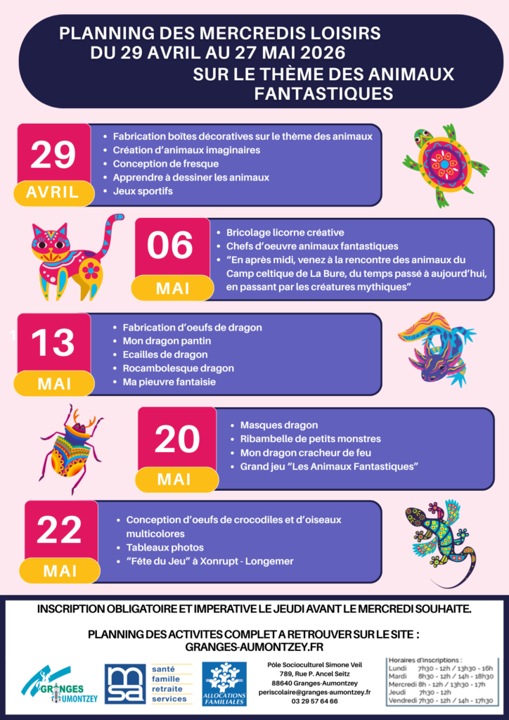 Planning des mercredis loisirs du 29 avril 2026 au 27 mai 2026